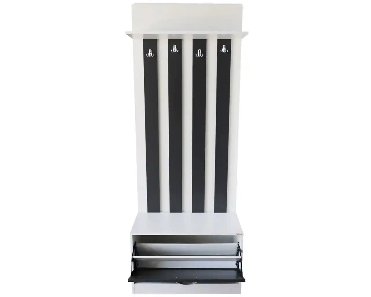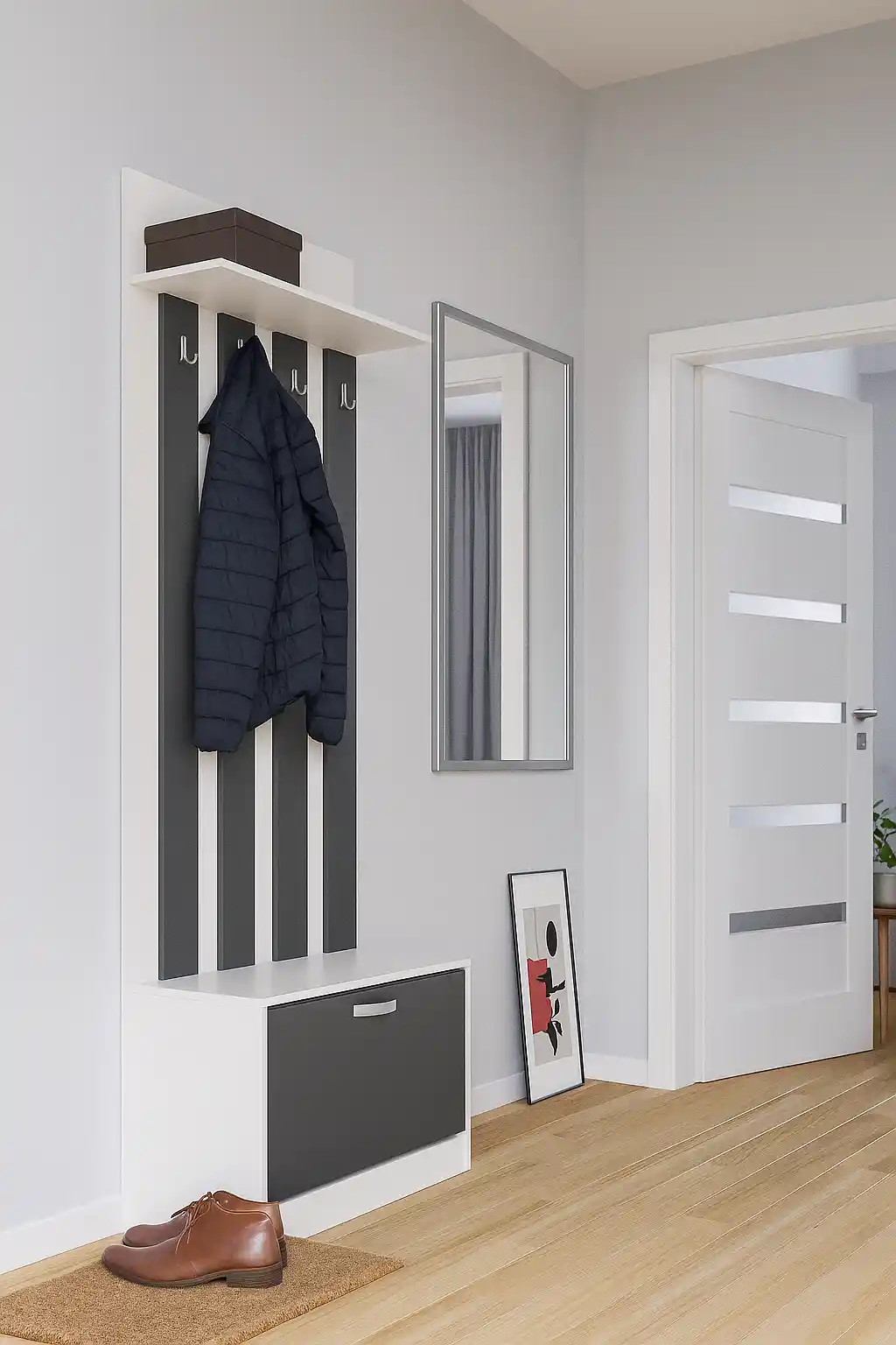 Completează amenajarea holului cu Cuierul cu Pantofar 80 alb cu gri, o piesă de mobilier practică și modernă, gândită pentru a economisi spațiu și a aduce eleganță zonei de intrare.