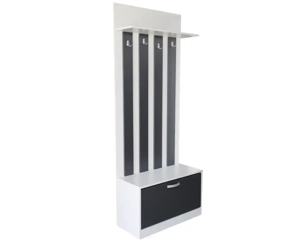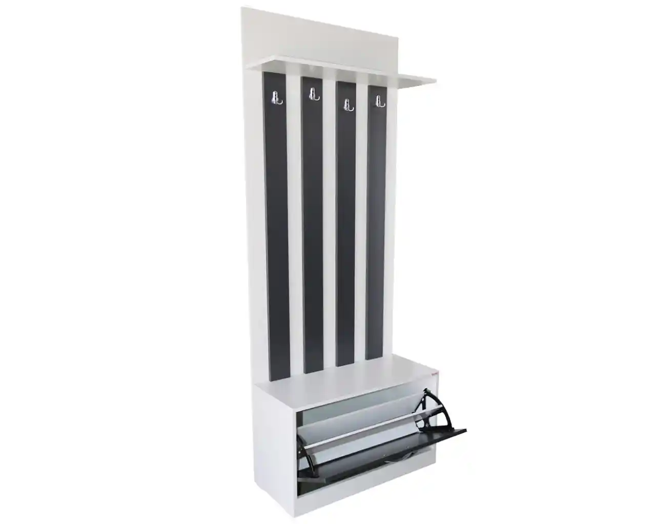 Cuier cu pantofar 80 alb cu gri, realizat din PAL melaminat de calitate, format din panou cu agățători și spațiu pentru încălțăminte. Finisaj modern alb cu gri antracit, ideal pentru holuri elegante și funcționale.