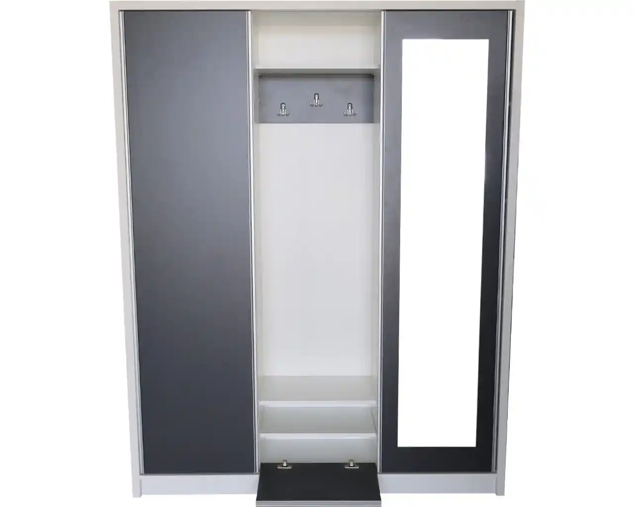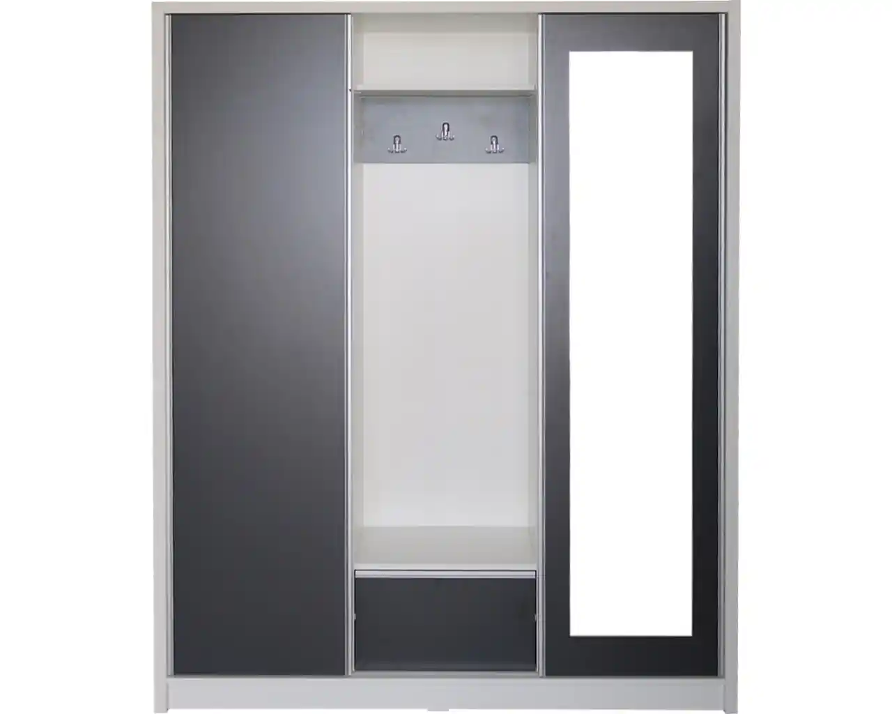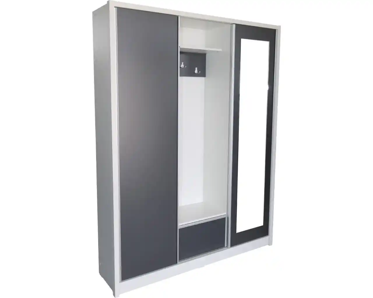 Holul este primul spațiu pe care îl vezi când intri în casă și primul pe care îl văd musafirii. Cuierul DAVID MAX alb cu gri, cu uși glisante și compartimentare inteligentă, îți oferă o soluție completă pentru depozitarea hainelor, încălțămintei și accesoriilor, menținând totul ordonat și elegant.