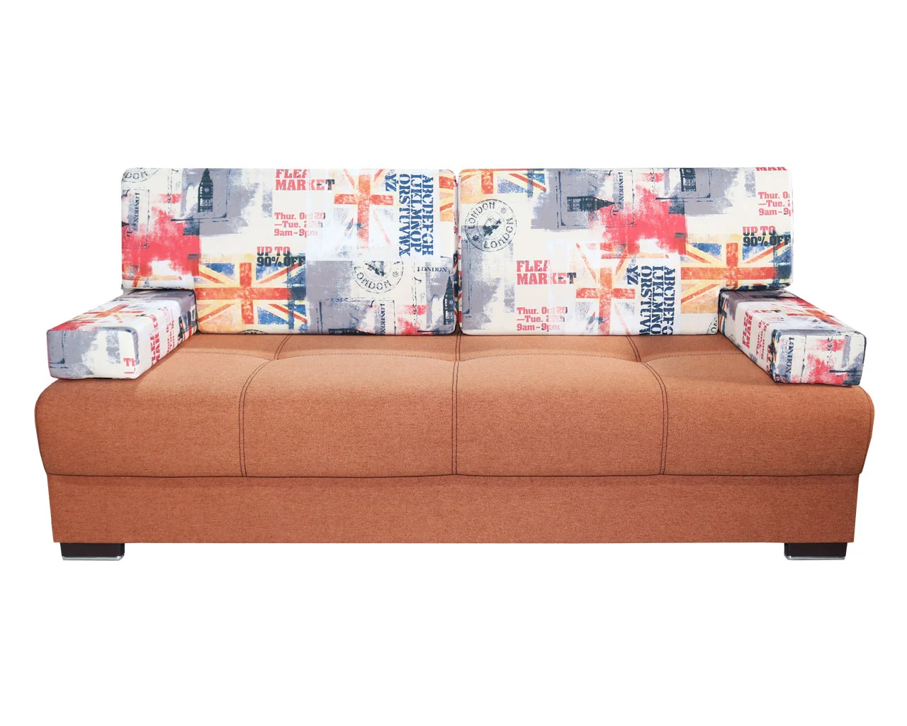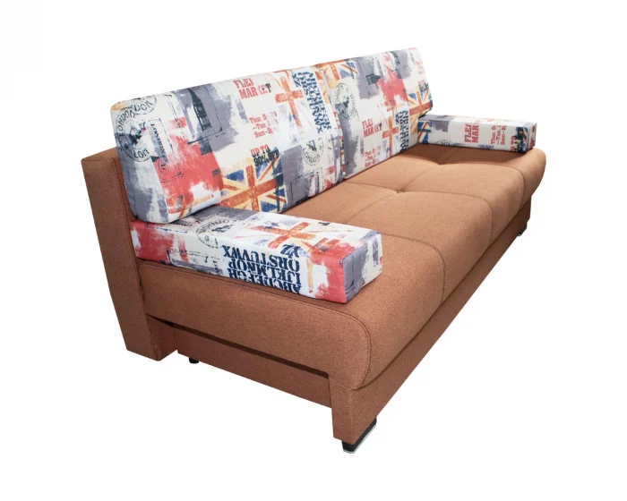Tapițeria din stofă N52, în nuanță cărămiziu, împreună cu pernele decorative Flaga GB, oferă un aspect cald și elegant, ușor de integrat atât în amenajări moderne, cât și clasice.