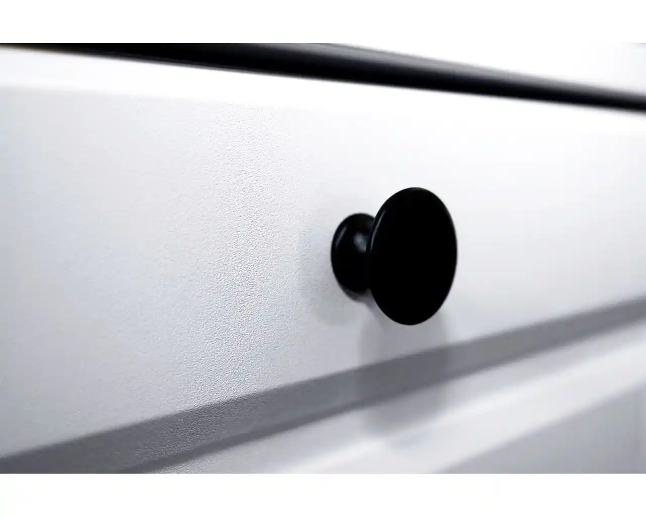 Fronturile realizate din MDF alb mat adaugă un plus de rafinament și rezistență. Suprafața este ușor de întreținut și curățat, iar culoarea neutră face ca piesa de mobilier să se potrivească atât cu pereți în tonuri calde, cât și cu decoruri în culori reci.