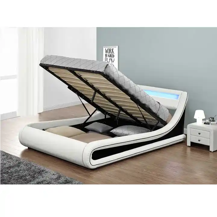 Pat matrimonial tapițat cu piele ecologică, somieră rabatabilă și spațiu de depozitare.